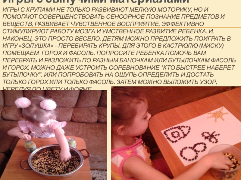 развивают мелкую моторику, но и помогают совершенствовать сенсорное познание предметов и веществ, развивает чувственное восприятие, эффективно стимулируют работу мозга и умственное развитие ребенка. И, наконец, это просто весело. Детям можно предложить поиграть в игру «Золушка» - перебирать крупы. Для этого в кастрюлю (миску) помещаем горох и фасоль. Попросите ребенка помочь Вам перебрать и разложить по разным баночкам или бутылочкам фасоль и горох. Можно даже устроить соревнование “Кто быстрее наберет бутылочку”. Или попробовать на ощупь определить и достать только горох или только фасоль. Затем можно выложить узор, чередуя по цвету и форме.