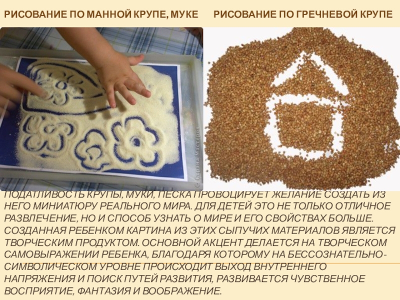 Слайд 4Податливость крупы, муки, песка провоцирует желание создать из него миниатюру реального
