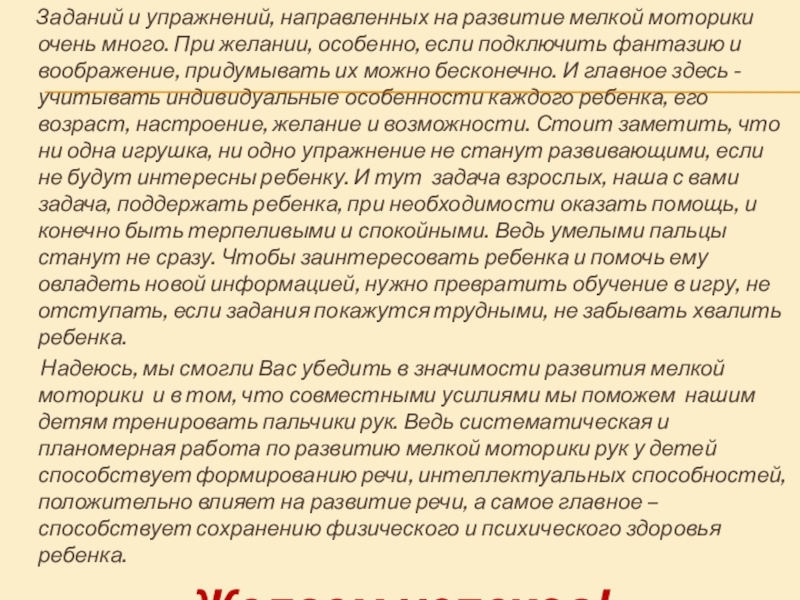 Надеюсь, мы смогли Вас убедить в значимости развития мелкой моторики и в том, что совместными усилиями мы поможем нашим детям тренировать пальчики рук. Ведь систематическая и планомерная работа по развитию мелкой моторики рук у детей способствует формированию речи, интеллектуальных способностей, положительно влияет на развитие речи, а самое главное – способствует сохранению физического и психического здоровья ребенка.