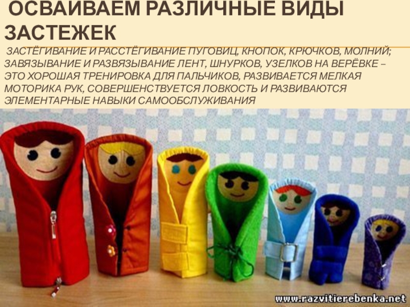 крючков, молний; завязывание и развязывание лент, шнурков, узелков на верёвке – это хорошая тренировка для пальчиков, развивается мелкая моторика рук, совершенствуется ловкость и развиваются элементарные навыки самообслуживания
