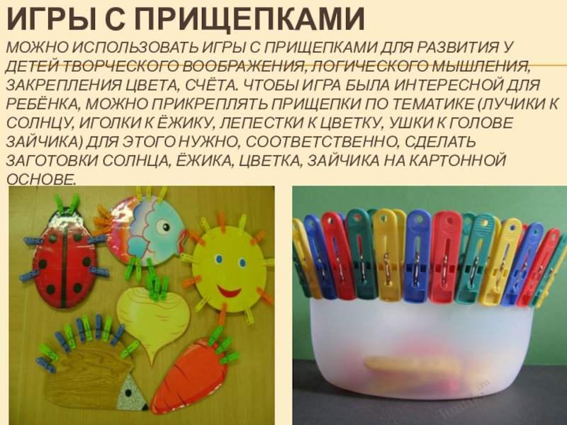 творческого воображения, логического мышления, закрепления цвета, счёта. Чтобы игра была интересной для ребёнка, можно прикреплять прищепки по тематике (лучики к солнцу, иголки к ёжику, лепестки к цветку, ушки к голове зайчика) Для этого нужно, соответственно, сделать заготовки солнца, ёжика, цветка, зайчика на картонной основе.