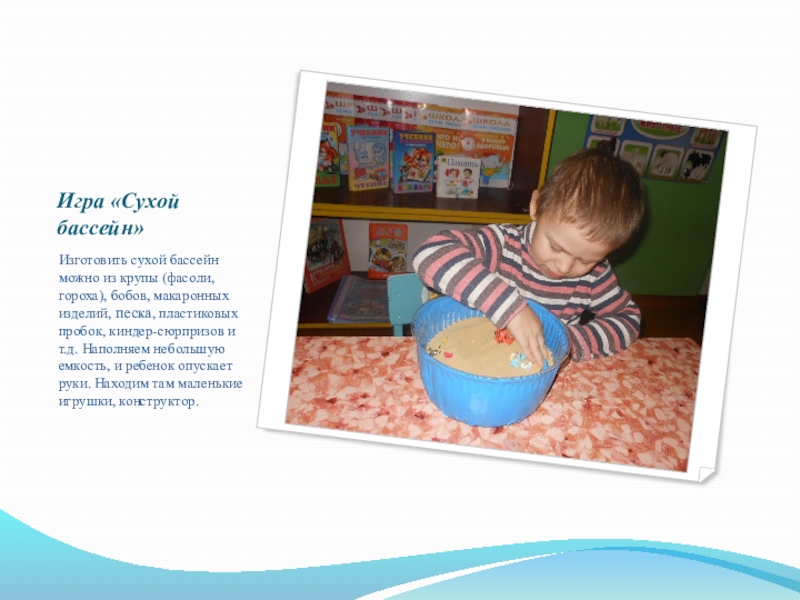 макаронных изделий, песка, пластиковых пробок, киндер-сюрпризов и т.д. Наполняем небольшую емкость, и ребенок опускает руки. Находим там маленькие игрушки, конструктор.