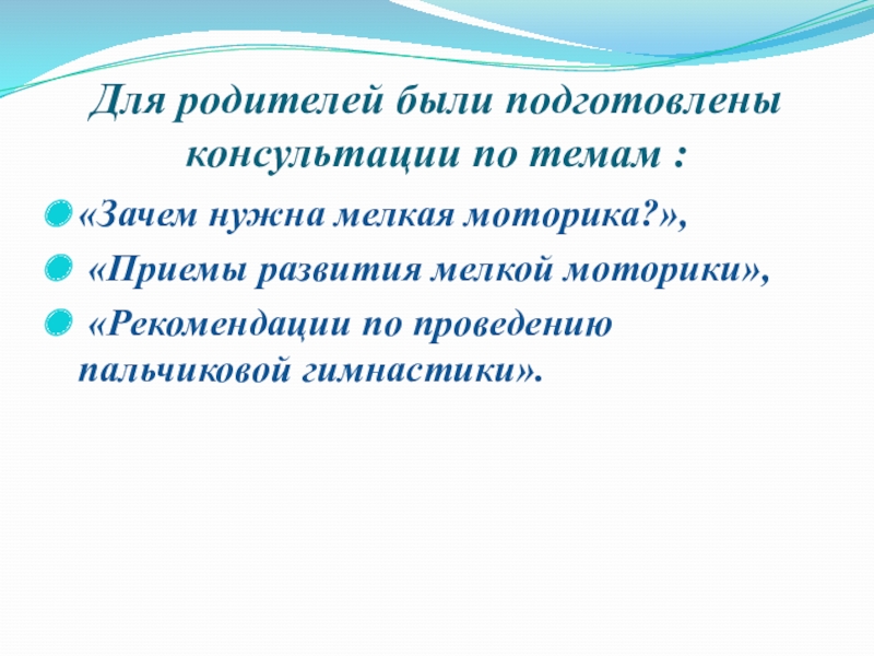 Слайд 19Для родителей были подготовлены консультации по темам :