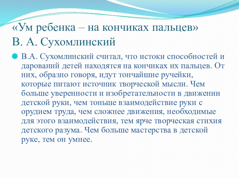истоки способностей и дарований детей находятся на кончиках их пальцев. От них, образно говоря, идут тончайшие ручейки, которые питают источник творческой мысли. Чем больше уверенности и изобретательности в движении детской руки, чем тоньше взаимодействие руки с орудием труда, чем сложнее движения, необходимые для этого взаимодействия, тем ярче творческая стихия детского разума. Чем больше мастерства в детской руке, тем он умнее.