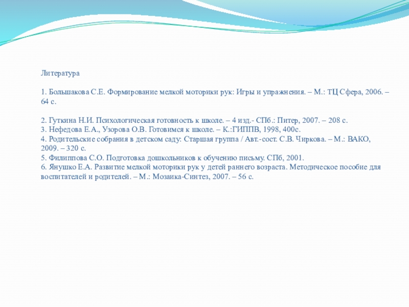 1. Большакова С.Е. Формирование мелкой моторики рук: Игры и упражнения. –