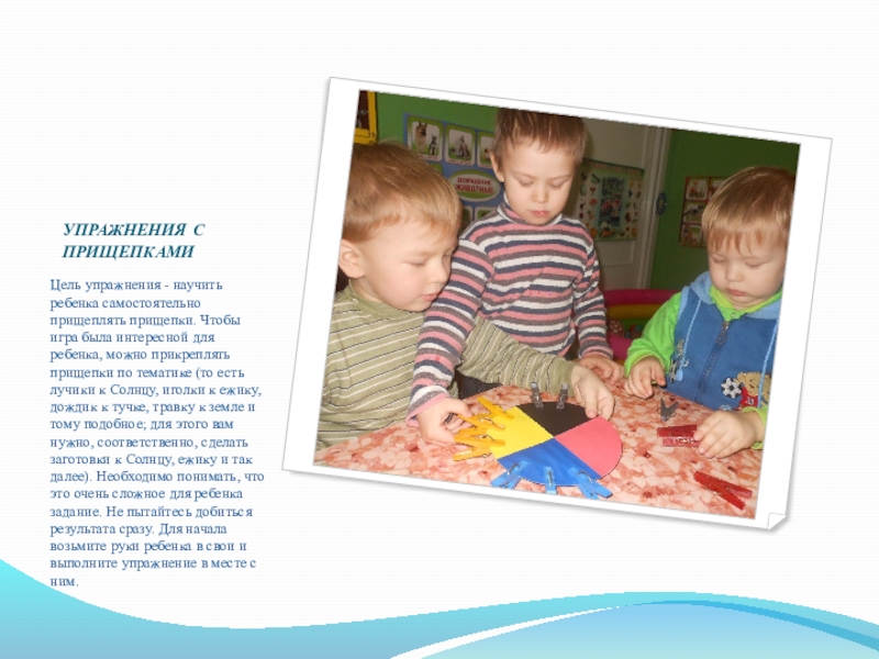 Цель упражнения - научить ребенка самостоятельно прищеплять прищепки. Чтобы