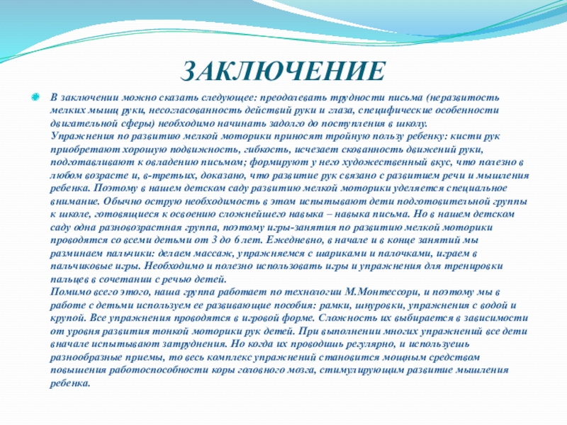 В заключении можно сказать следующее: преодолевать трудности письма (неразвитость мелких мышц