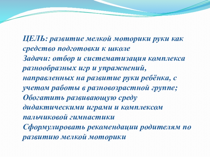 Слайд 4ЦЕЛЬ: развитие мелкой моторики руки как средство подготовки к школе