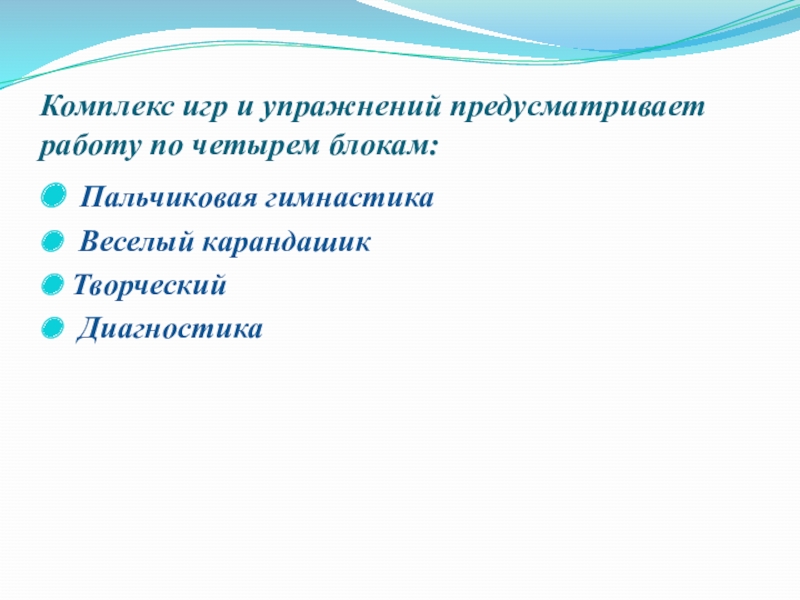 Слайд 5Комплекс игр и упражнений предусматривает работу по четырем блокам: