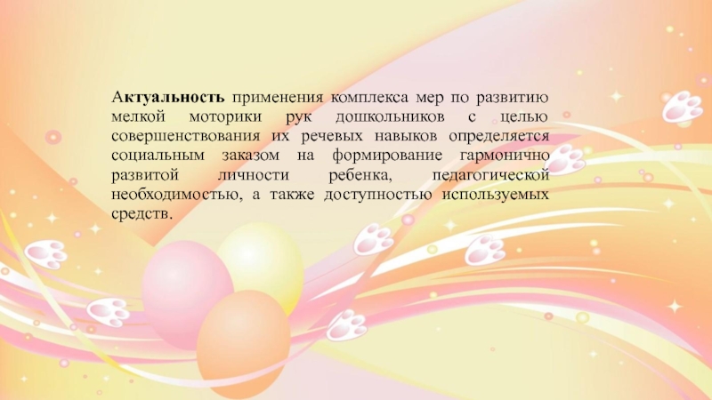 Слайд 3Актуальность применения комплекса мер по развитию мелкой моторики рук дошкольников с