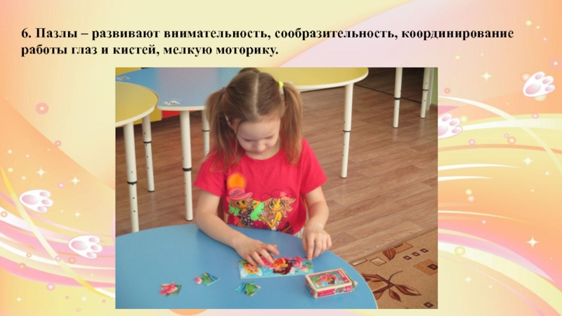6.Пазлы – развивают внимательность, сообразительность, координирование работы глаз и кистей, мелкую моторику.