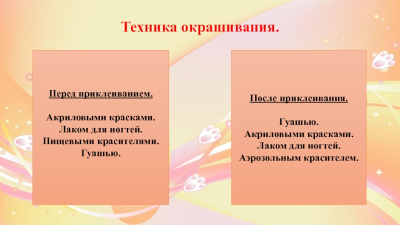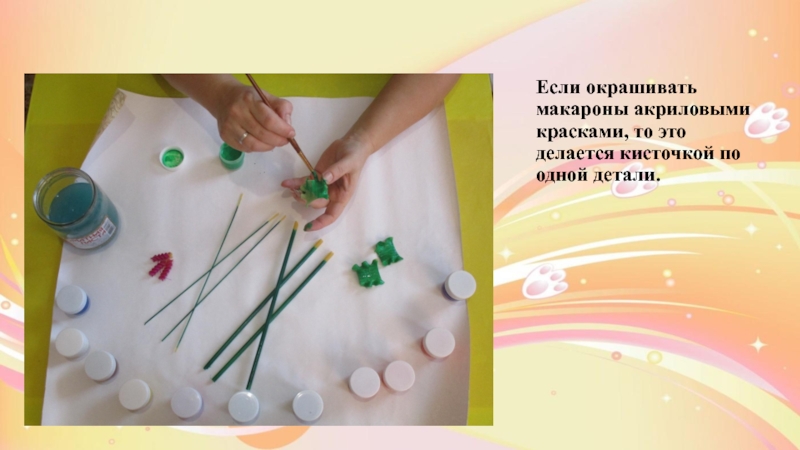 Слайд 26Если окрашивать макароны акриловыми красками, то это делается кисточкой по одной