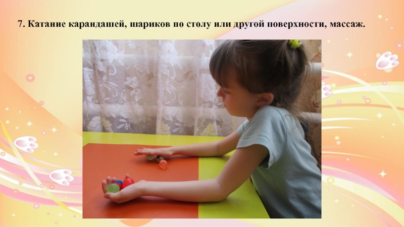 Слайд 127. Катание карандашей, шариков по столу или другой поверхности, массаж.