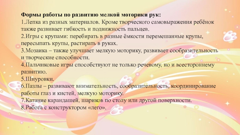 Слайд 5Формы работы по развитию мелкой моторики рук: