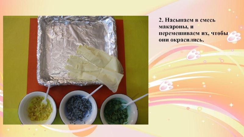 Слайд 282. Насыпаем в смесь макароны, и перемешиваем их, чтобы они окрасились.