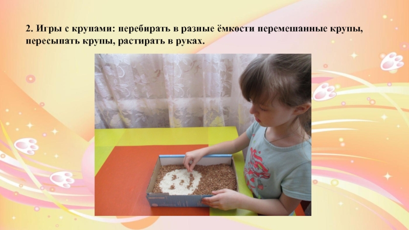 Слайд 72. Игры с крупами: перебирать в разные ёмкости перемешанные крупы, пересыпать