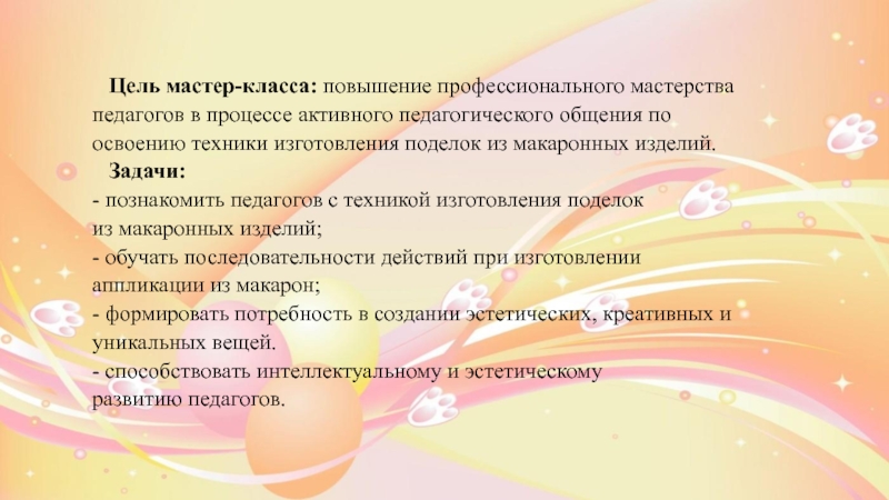 - познакомить педагогов с техникой изготовления поделок из макаронных изделий;