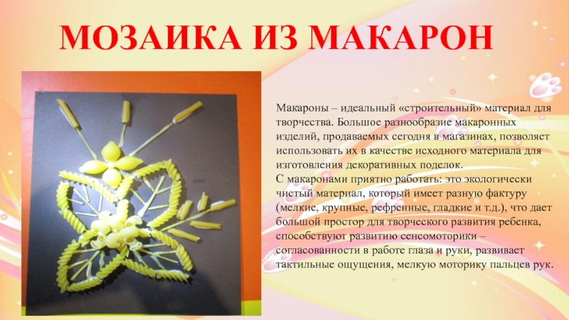 С макаронами приятно работать: это экологически чистый материал, который имеет разную фактуру (мелкие, крупные, рефренные, гладкие и т.д.), что дает большой простор для творческого развития ребенка, способствуют развитию сенсомоторики – согласованности в работе глаза и руки, развивает тактильные ощущения, мелкую моторику пальцев рук.