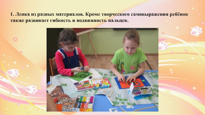 Слайд 61. Лепка из разных материалов. Кроме творческого самовыражения ребёнок также развивает