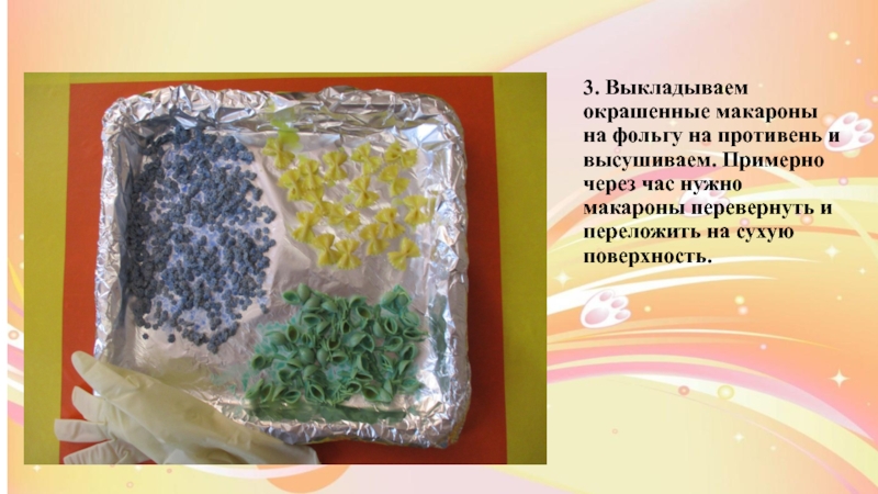 Слайд 293. Выкладываем окрашенные макароны на фольгу на противень и высушиваем. Примерно