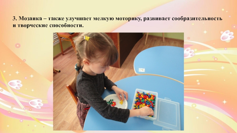 3.Мозаика – также улучшает мелкую моторику, развивает сообразительность и творческие способности.