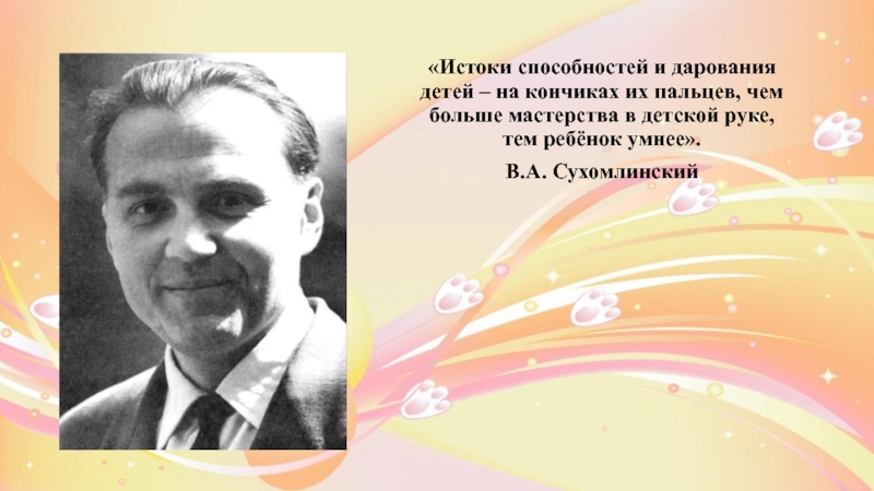 Слайд 4«Истоки способностей и дарования детей – на кончиках их пальцев, чем