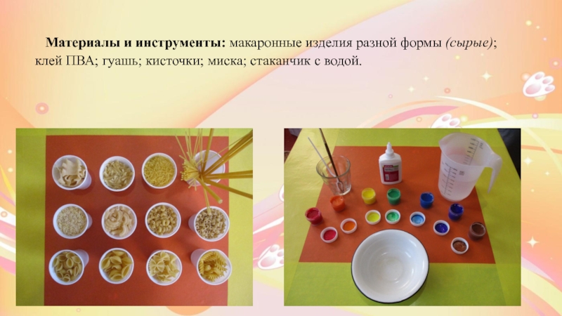 Слайд 24Материалы и инструменты: макаронные изделия разной формы (сырые); клей ПВА; гуашь; кисточки; миска; стаканчик