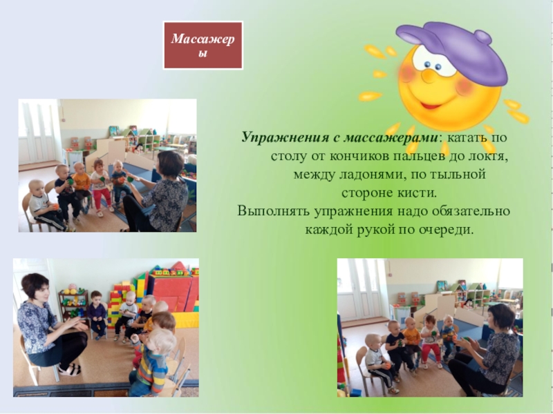 Слайд 17Упражнения с массажерами: катать по столу от кончиков пальцев до локтя,