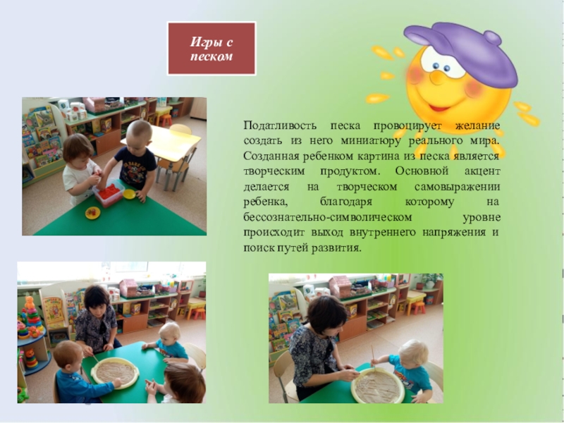 ребенком картина из песка является творческим продуктом. Основной акцент делается на творческом самовыражении ребенка, благодаря которому на бессознательно-символическом уровне происходит выход внутреннего напряжения и поиск путей развития.