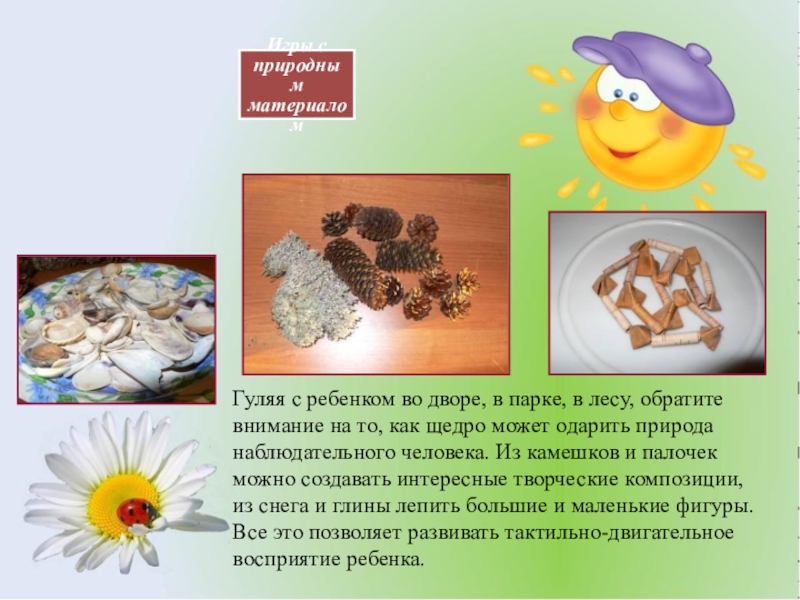 на то, как щедро может одарить природа наблюдательного человека. Из камешков и палочек можно создавать интересные творческие композиции, из снега и глины лепить большие и маленькие фигуры. Все это позволяет развивать тактильно-двигательное восприятие ребенка.