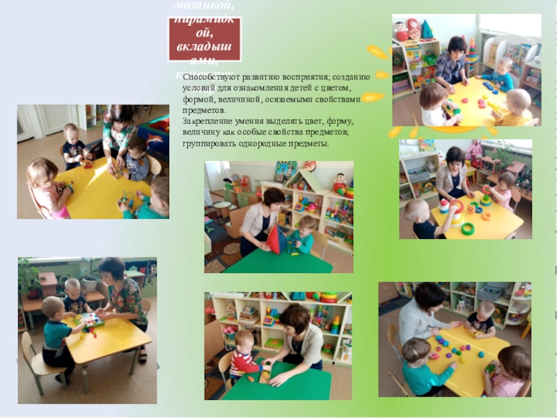 Слайд 12Способствуют развитию восприятия; созданию условий для ознакомления детей с цветом, формой,