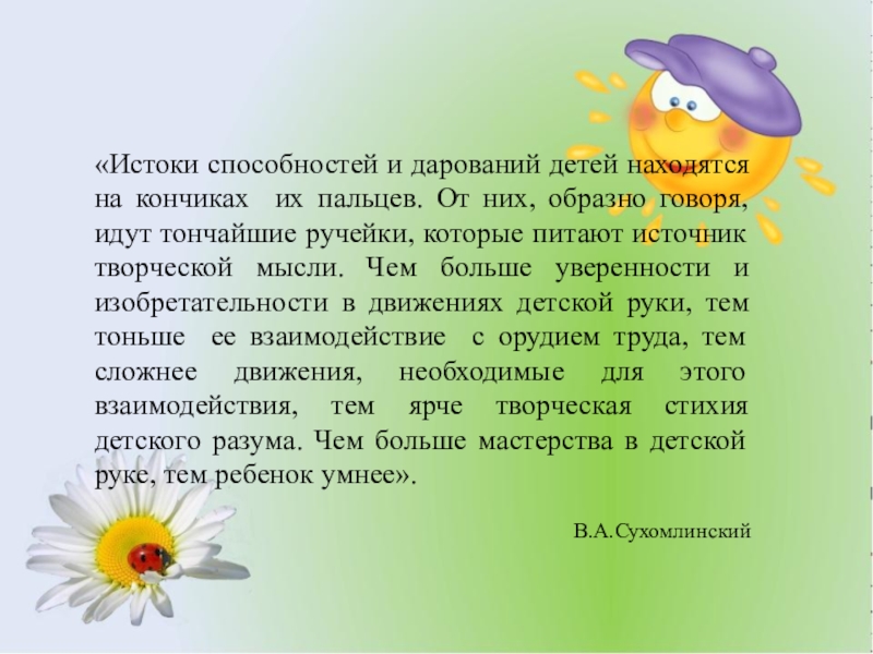 Слайд 2«Истоки способностей и дарований детей находятся на кончиках их пальцев. От