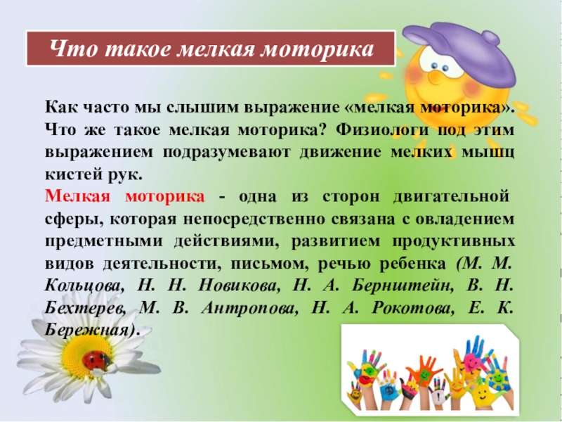 Мелкая моторика - одна из сторон двигательной сферы, которая непосредственно связана с овладением предметными действиями, развитием продуктивных видов деятельности, письмом, речью ребенка (М. М. Кольцова, Н. Н. Новикова, Н. А. Бернштейн, В. Н. Бехтерев, М. В. Антропова, Н. А. Рокотова, Е. К. Бережная).