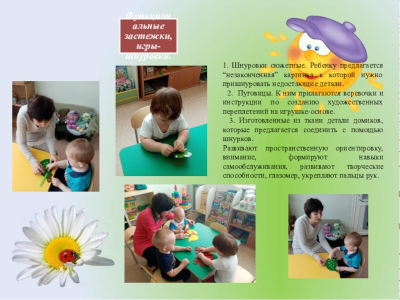 Слайд 131. Шнуровки сюжетные. Ребенку предлагается “незаконченная” картинка к которой нужно пришнуровать