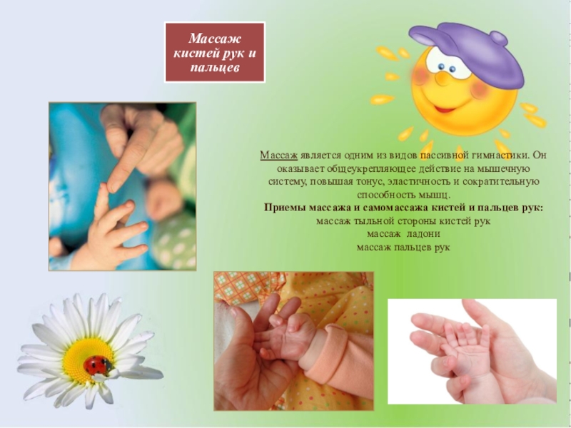Слайд 16Массаж является одним из видов пассивной гимнастики. Он оказывает общеукрепляющее действие