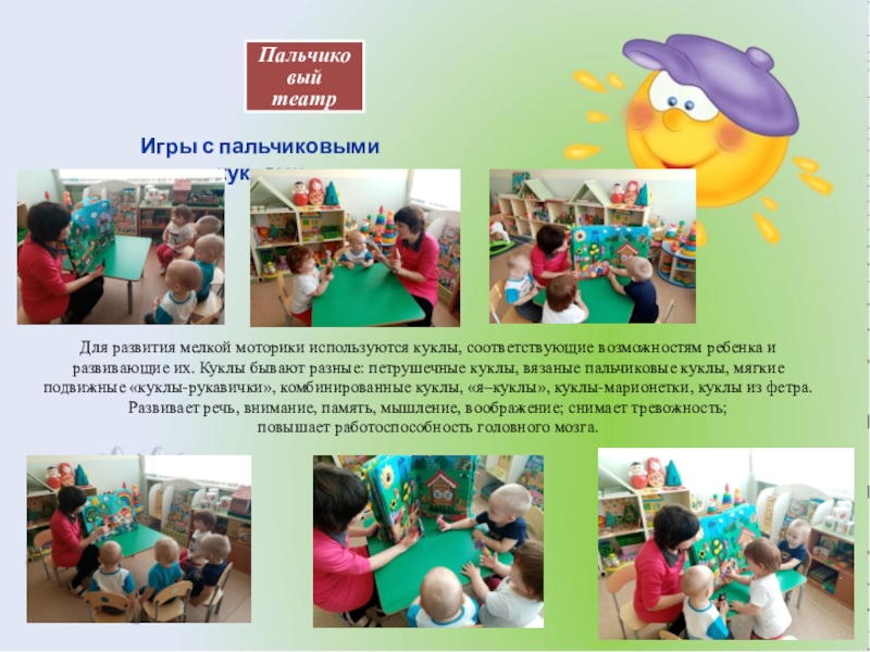их. Куклы бывают разные: петрушечные куклы, вязаные пальчиковые куклы, мягкие подвижные «куклы-рукавички», комбинированные куклы, «я–куклы», куклы-марионетки, куклы из фетра. Развивает речь, внимание, память, мышление, воображение; снимает тревожность;