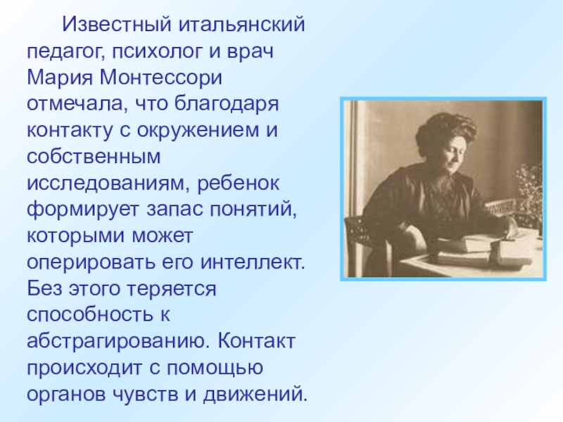Слайд 3 Известный итальянский педагог, психолог и врач Мария Монтессори отмечала, что благодаря