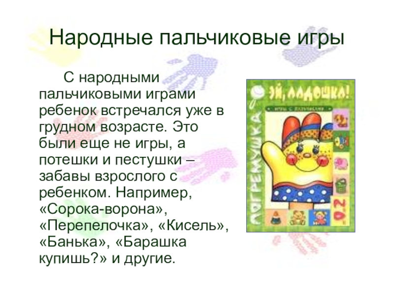 возрасте. Это были еще не игры, а потешки и пестушки – забавы взрослого с ребенком. Например, «Сорока-ворона», «Перепелочка», «Кисель», «Банька», «Барашка купишь?» и другие.