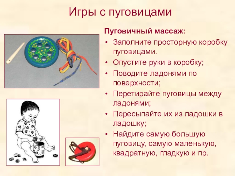 или несколько шариков или бусинок. Ребенок ощупывает их через ткань, перебирает пальчиками, массируя активные зоны руки.