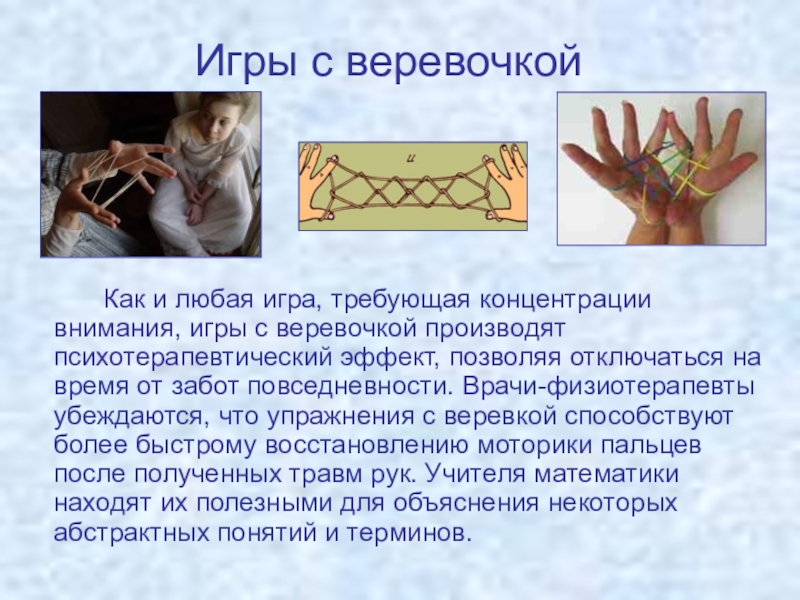 веревочкой производят психотерапевтический эффект, позволяя отключаться на время от забот повседневности. Врачи-физиотерапевты убеждаются, что упражнения с веревкой способствуют более быстрому восстановлению моторики пальцев после полученных травм рук. Учителя математики находят их полезными для объяснения некоторых абстрактных понятий и терминов.
