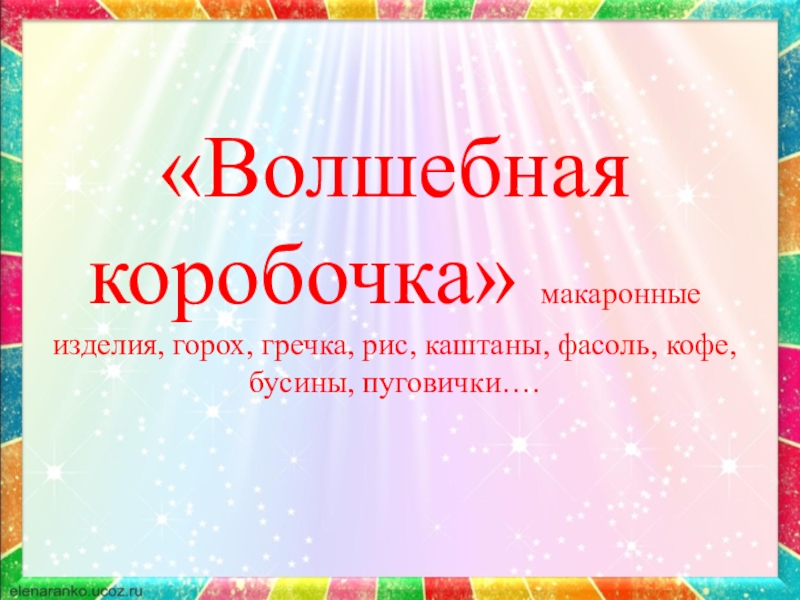 Слайд 19«Волшебная коробочка» макаронные изделия, горох, гречка, рис, каштаны, фасоль, кофе, бусины,