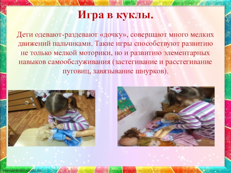 Дети одевают-раздевают «дочку», совершают много мелких движений пальчиками. Такие