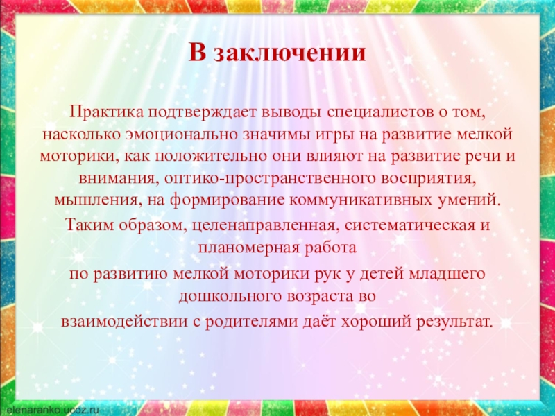 на развитие мелкой моторики, как положительно они влияют на развитие речи и внимания, оптико-пространственного восприятия, мышления, на формирование коммуникативных умений.