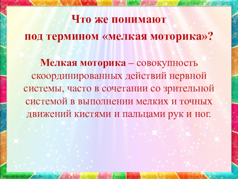 мелкая моторика связана с двигательной, зрительной памятью, координацией. Регулярные упражнения улучшают мышление, повышают внимание, развивают наблюдательность;
