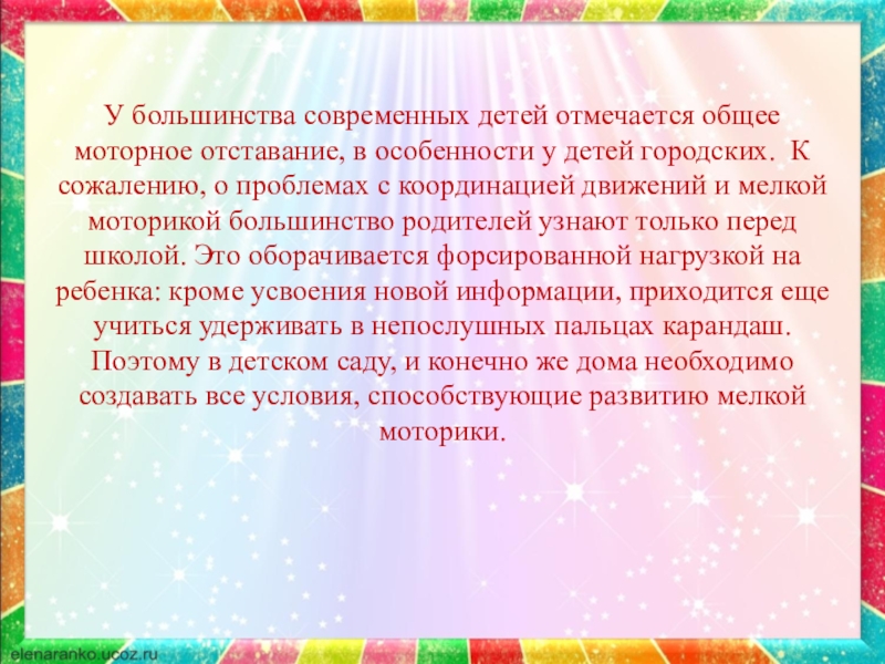 у детей городских. К сожалению, о проблемах с координацией движений и мелкой моторикой большинство родителей узнают только перед школой. Это оборачивается форсированной нагрузкой на ребенка: кроме усвоения новой информации, приходится еще учиться удерживать в непослушных пальцах карандаш. Поэтому в детском саду, и конечно же дома необходимо создавать все условия, способствующие развитию мелкой моторики.