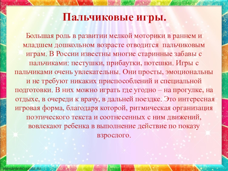 дошкольном возрасте отводится пальчиковым играм. В России известны многие старинные забавы с пальчиками: пестушки, прибаутки, потешки. Игры с пальчиками очень увлекательны. Они просты, эмоциональны и не требуют никаких приспособлений и специальной подготовки. В них можно играть где угодно – на прогулке, на отдыхе, в очереди к врачу, в дальней поездке. Это интересная игровая форма, благодаря которой, ритмическая организация поэтического текста и соотнесенных с ним движений, вовлекают ребенка в выполнение действие по показу взрослого.