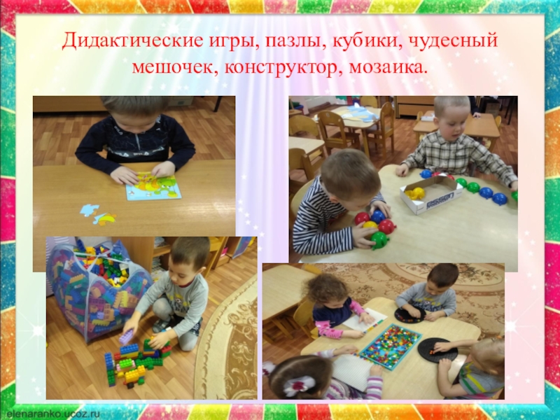 Слайд 23Дидактические игры, пазлы, кубики, чудесный мешочек, конструктор, мозаика.