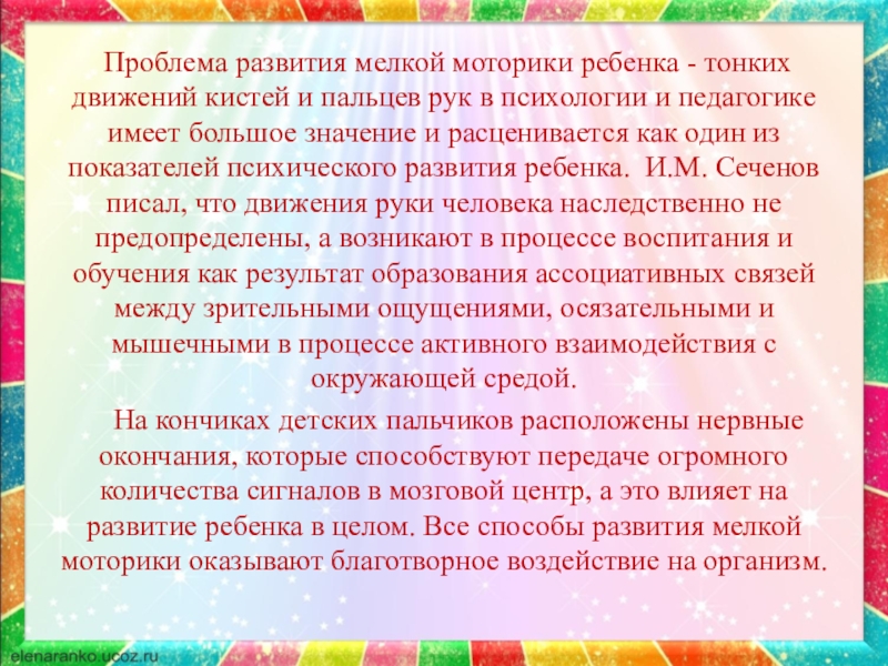 пальцев рук в психологии и педагогике имеет большое значение и расценивается как один из показателей психического развития ребенка. И.М. Сеченов писал, что движения руки человека наследственно не предопределены, а возникают в процессе воспитания и обучения как результат образования ассоциативных связей между зрительными ощущениями, осязательными и мышечными в процессе активного взаимодействия с окружающей средой.
