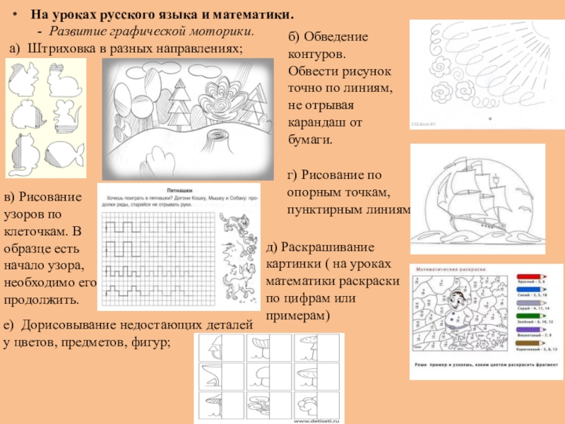д) Раскрашивание картинки ( на уроках математики раскраски по цифрам или примерам)