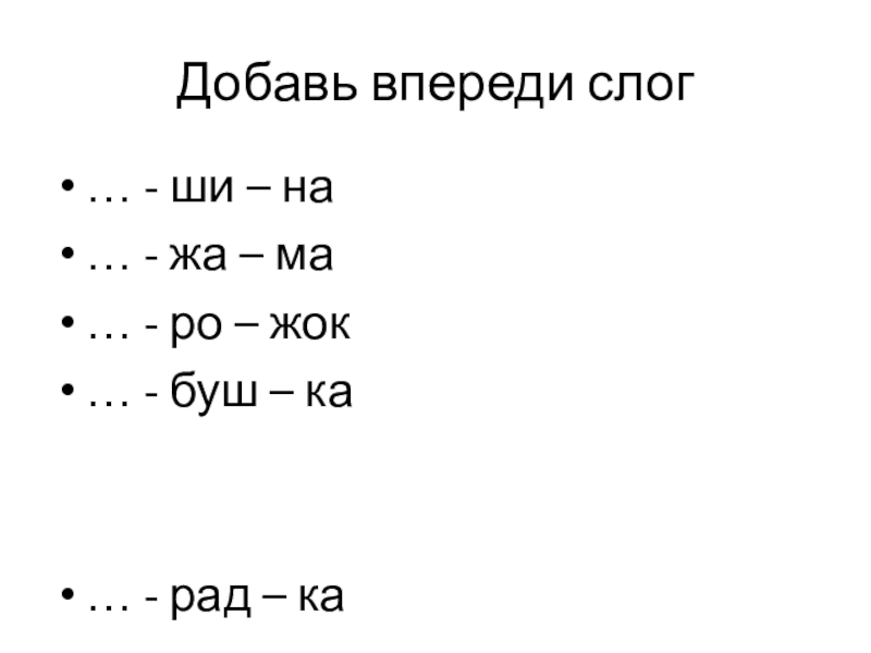 Добавь впереди слог… - ши – на… - жа – ма… - ро – жок… - буш
